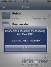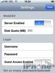 Login(登錄)下的設定可設定用戶名密碼,設定完後,若是在PC機上用WebDAV功能訪問的話,則需要輸入用戶名密碼才可訪問/private/var/mobile/Documents/Files裡的文件,為空是則可匿名訪問。