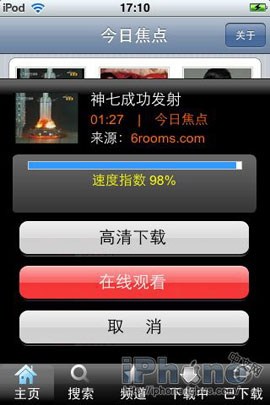 在“頻道”或者“搜索”內容列表頁中,點擊視頻內容會彈出下載框,有 “速度指數”“高清下載” “在線觀看”“取消”選項。