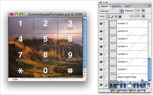 1.找一張你的合適大小的圖片,嚴格按照寬320相素,高273相素的尺寸。之後我們就開始添加按鍵。走這捷徑,這有一個外國兄弟提供的模板★點擊這裡下載★,你可以在這個PSD圖中修改你的圖片。你可以把自己的圖替換到“your picture goes here”圖層,數字按鍵則對應“Apple stock image”圖層。 如果你的PS技巧很不錯,也可以修改其它圖層或者自己創建。