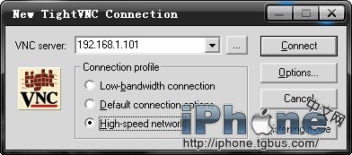 2.之後會彈出圖2所示的界面,這時我們需要查看iPhone的IP地址,可以在iPhone的“設置”中找到,找到後將IP地址填入圖2的VNC server這一欄中,填好後點擊“Connect”進行連接。