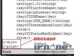 刪除後將後面的文字保持格式不變向上平移2行,變成圖2所示的樣子,接著使用Pledit保存並退出,將修改好的Info.plist傳回重新xxxxx.app再安裝就好了。