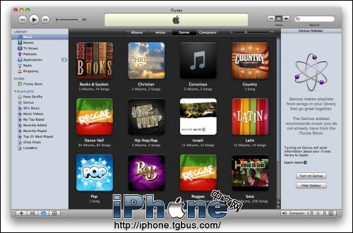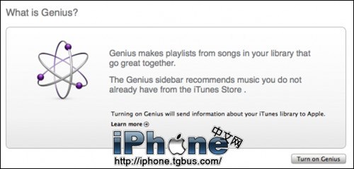 Genius(天才)將會為iTunes的資料庫內的歌曲制作一個列表, 以便幫你找到更多的歌曲,而且Genius工具條還會向您建議您從未聽過的歌曲。