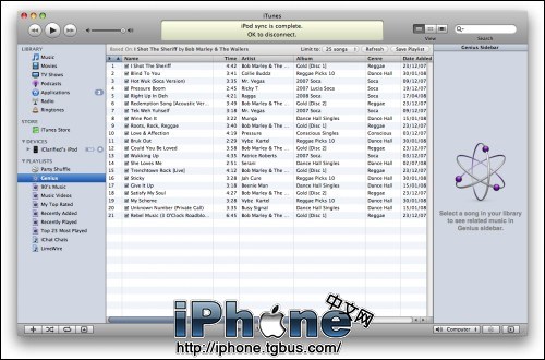 第二步:注意iTunes窗口右端的新的Genius工具條。如果未出現在窗口中,您可以按一下Genius工具條切換按鈕。