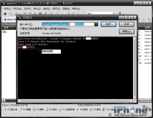 2.iPhone版:解壓後將iLog2.0-keygen-iPhone上傳至iPhone的/var/mobile/文件夾,然後使用WinSCP中的Putty或者在iPhone的Terminal上輸入這個指令: