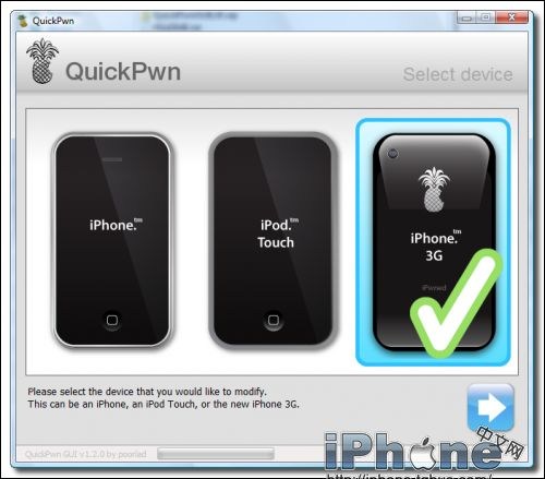 第三步:雙擊提取的.exe文件(QuickPwnGUI120.exe)發布QuickPwn。你將被提示選擇iPhone版本,然後點擊藍色向右箭頭繼續。