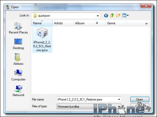 第四步:一個彈出的窗口將會提示你選擇iPhone固件,選擇剛從你的桌面quickpwn文件夾中下載的固件文件,然後點擊“open”按鈕。
