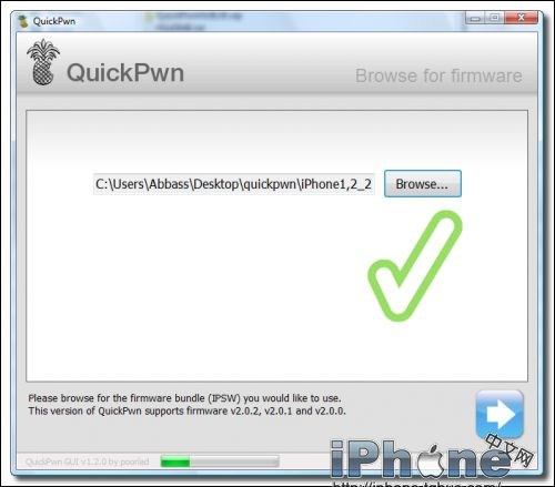 第五步:如果你選擇的iPhone固件文件有效,QuickPwn將會顯示一個綠色的檢查圖標。點擊藍色向右箭頭繼續。