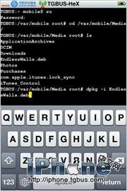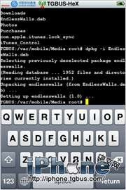 4.好了,我們來輸入安裝指令dpkg -i EndlessWalls.deb(圖5),之後Terminal會提示你開始安裝並進行設置(圖6),速度很快,之後退出並刷新桌面就完成安裝了,一切都在iPhone上進行,很方便。