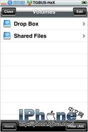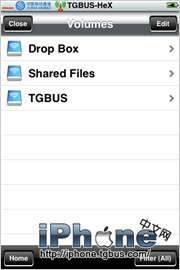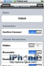 3.我們先來試著添加一個分區,在圖3的畫面中點擊“Add Volume”進入圖4的畫面,填好新分區的名字,例如:TGBUS。下面的屬性設置可根據個人需要修改,“Confirm Connect”可以選擇連接時是否彈出確認提示,“Hidden”是隱藏屬性開關,“Browsable”是設置浏覽權限,“Readable”是設置閱讀權限,“Writable”是設置寫入權限,最後的“iTunes Backup”可選擇是否使用iTunes備份。設置好之後點擊右上角的“Save”返回主界面,這時我們就能看到新加的分區了(圖5)。