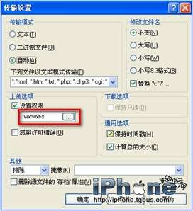 點擊左下角的“傳輸設置-自定義”,可在彈出的設置窗口中設置權限為0777,即我們平時所說的最大運行權限(所有的復選框都是選中)。