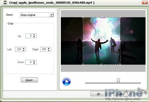 3.然後點擊圖2所示的“Crop”按鈕來調整視頻大小,就會進入圖3的界面,可以拖動右邊窗口中的邊線或者在左邊輸入數字來調整視頻的尺寸。小提示:圖1中的“Trim”按鈕可以用來對視頻進行剪輯,如果你想截取某個MV或者電影的其中一段的話可以使用這個功能來實現。