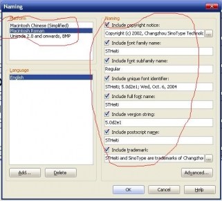 用FontCreator打開想要更改的字體,再Format菜單內選Naming,記錄裡面的信息,注意每個Platform裡面的信息都要記錄無誤。