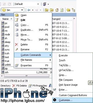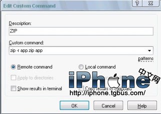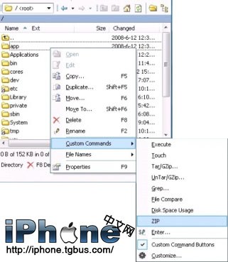 現在,我們開始對app文件夾進行壓縮,鼠標單擊iPhone內的app文件夾,再點鼠標右鍵,選擇custom commands,再選擇ZIP(這個ZIP就是我們之前添加進去的壓縮命令)