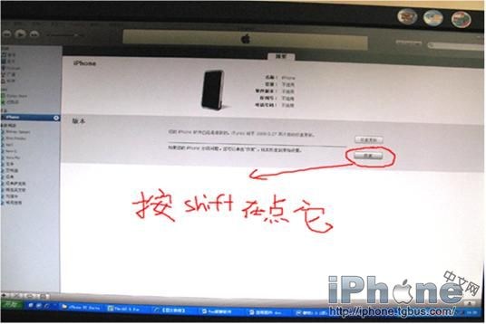 2.打開iTunes連接iPhone到電腦,先關機然後在同時按住“電源+Home”之後會出現白蘋果,這時松開“電源”鍵,這時iPhone上會出現一個黃色三角,緊接著電腦就會讓你恢復,這時候按鍵盤的“Shift”鍵然後點“恢復”這時選擇你下載好的1.1.4固件