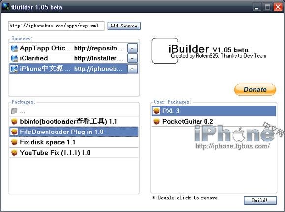 2.如果你使用過installer,你會知道“源”對installer非常重要。那麼iBuilder的優秀之處就是在於利用了源的特性,將你喜歡的第三方軟件和補丁打包生成一個文件後,將其整合進你的自制固件裡。