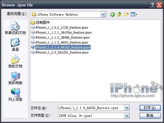 2.確保你已經下載好了1.1.4固件之後,請點擊“Browse.ipsw”按鈕,在彈窗的窗口中選中iPhone1.1.4固件。