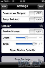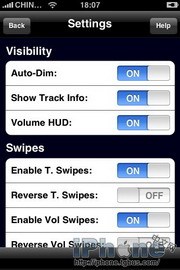 2.第二塊是“Swipes”,這塊主要是用來調整重力感應相關設置的。“Enable T. Swipes”開關可以調整是否靠重力感應切換歌曲,軟件默認是向右甩下一曲,左甩為上一曲,而“Reverse T. Swipes”的作用是使這個效果相反。“Enable Vol Swipes”可以讓你靠上下晃動iPhone來調整音量,下面的“Reverse Vol Swipes”也是起到一個反向調整的作用。