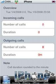 點擊左下角的Overview就可以看到通話信息的概況,上面的兩行是接到的電話數量和持續時間,反之下面的兩行就是撥出電話的信息。