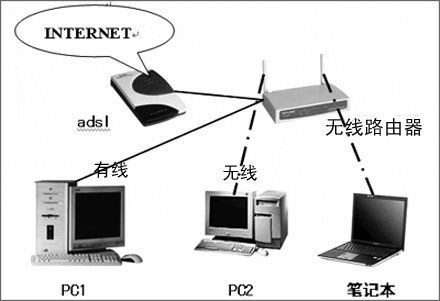 下面就講講家庭如何通過無線路由器連入Internet。這裡我們只以常見的ADSL接入Internet為例。請看下圖: