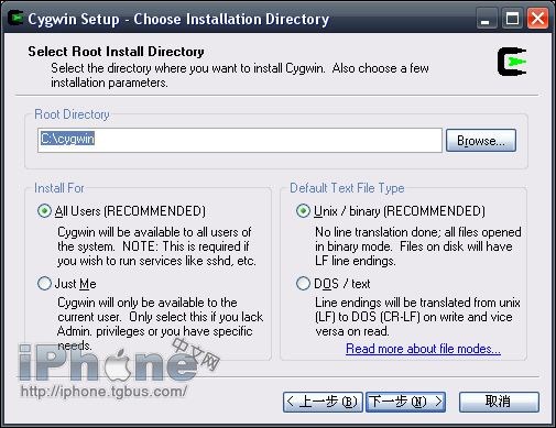 3.Root Directory這裡可以更改Cygwin的安裝目錄,默認是安裝在C:\cygwin目錄下,其他選擇默認,點擊“下一步”按鈕。