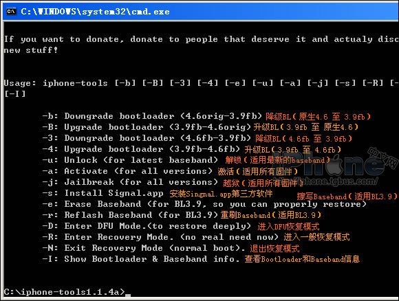 以下截圖是iphone-tools工具的常用命令使用,這裡的Fakeblank簡稱fb,orig指的是原生的意思。