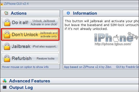 3.現在請在下載好的ZiPhone文件夾中雙擊“ZiPhoneGUI.exe”文件,在彈出的窗口種點擊“Don't Unlock”按鈕,即只進行Jailbreak和Activate步驟。此時,iPhone屏幕將不斷出現代碼,請勿擔心,1分鐘左右之後,iPhone將被激活成功。