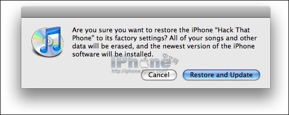 1.請先將你的iPhone連接上你的電腦,然後開啟iTunes識別出iPhone。點擊“恢復”按鈕,第一次彈出的窗口會提示你進行備份,請自行選擇。在第二次彈出的窗口會提示你進行恢復,那麼請點擊“恢復並更新”(如果你的1.1.4固件已經下載好的話,會自動更新最高固件,固件請放在“用戶/資源庫/itunes/iphone upgrades”目錄下,iphone upgrades文件夾需要自己新建。如果沒有,那麼它將首先下載1.1.4固件,然後再進行更新)