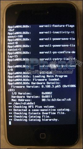 6.iNdependence將會彈出“Waiting for jail break...”的畫面,而iPhone屏幕將會不斷出現代碼,請勿擔心,1分鐘左右過後,你的iPhone就將會激活成功。