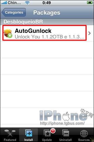 4.再次開啟installer,並點擊界面底部的“Install”,在“DesbloqueioBR”欄目下找到並安裝“AutoGunlock”,那麼程序將會開始自動為你解鎖iPhone。當程序執行完畢後,你就可以插入一張支持GMS網絡的SIM卡來撥打電話了。