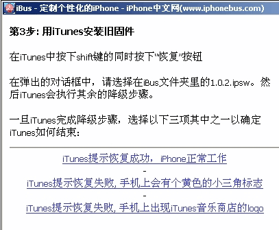 2. 按住鍵盤上的shift鍵,用鼠標點擊“恢復”按鈕,再彈出的提示框中找到並選擇你要降級的固件,點擊確認後,iTunes將會開始恢復你的iPhone,隨後如果出現“不能重新安裝,不明錯誤(1)”,我們需要用iBus識別一下iPhone 。