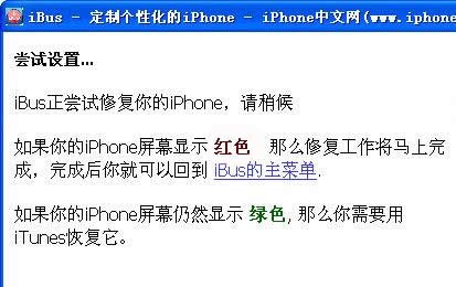 你看到iPhone屏幕顯示綠色,從第3步開始重新操作一次,最終用iBus導入後iPhone屏幕變成紅色,隨後恢復到正常狀態,你就可以做你想做的了,比如說破解。