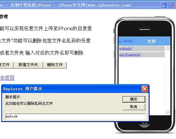 如上圖中所示,在點擊“刪除文件”按鈕後,會彈出一個提示框。那麼在這個提示框中,你可以輸入你想刪除的文件或者文件夾的名稱。如果你輸入“mybook”(不包括引號),並確定的話,此時將會直接刪除右側iPhone目錄中所顯示的mybook文件夾。
