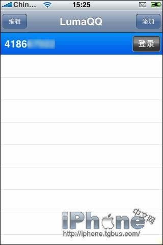 在你安裝好LumaQQ後,就可以使用iPhone打開主菜單中的LumaQQ。那麼此時進入的界面就是QQ登陸界面了。如果你已經設置好QQ號碼,那麼如下截圖所示,直接選擇登陸即可。這裡的“編輯”按鈕可以刪除或者編輯你登陸的QQ號帳號或者密碼。