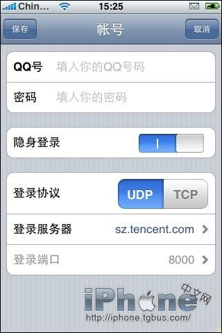 點擊“添加”按鈕後,就可以新建QQ帳戶信息了,這裡的“QQ號”和“密碼”是必須填入的,然後你也可以設置是否隱身登陸。那麼點擊“保存”後,QQ帳戶信息就已設置成功。
