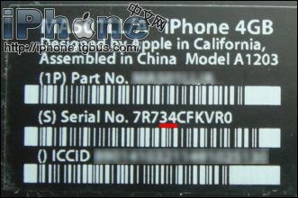 如果你是最近從美國購買的iPhone,不妨照看看包裝背後的“(S) Serial No.”後面的數字,如果在後面數字的第4位和第5位合起來要大於等於46的話,那麼你的機器就是原生1.1.2固件的iPhone,如果小於46,就不是的。這裡的第四位和第五位的數字合起來表示你的iPhone生產的周數,例如下圖中紅色標注顯示的“34”,說明此iPhone是第34周生產出來的。