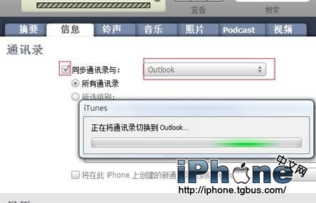 選擇 信息 ---------在同步通迅錄前打勾 ------下面有個子目錄 下拉會顯示有(WINDOWS 聯系人 / OUTLOOK / YAHOO….) 選擇 OUT LOOK ----------然後直接選擇最下面的同步就可以了