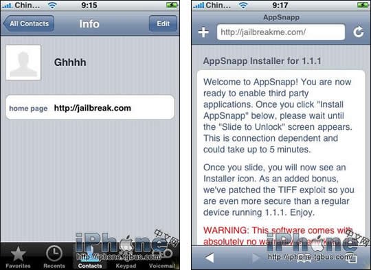 4.現在請重復第1-3的步驟,然後在你新建的聯系人網址中改為http://jailbreakme.com ,保存後,點擊此網址。你現在將會進入jailbreakme.com的網站。請用手指拖動頁面至底部,然後點擊“Install AppSnapp”的按鈕,safari將會在幾秒鐘後自動退出。