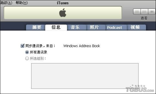 4.將iPhone與電腦連接後,打開iTunes,選擇“iPhone”那一欄,點擊“信息”,將“同步通訊錄”前面打勾,最後選擇同步即可將Outlook中輸入好的通訊簿同步到iPhone裡面,如下圖所示。