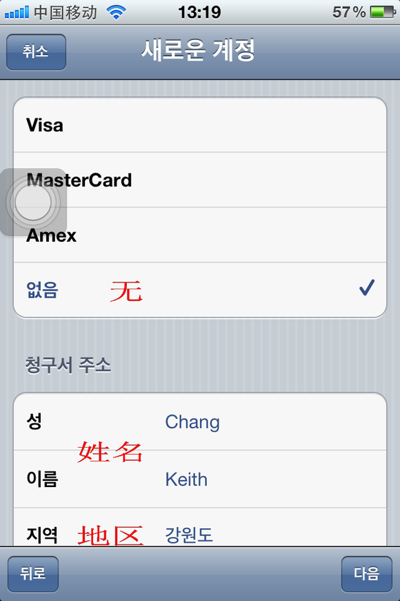 信用卡那裡也就是我也無的那裡選擇打鉤,姓名寫自己的(我的只是給大家參考)地區那裡選第二個,也就會我選的這個(韓國江源這個地方)