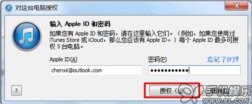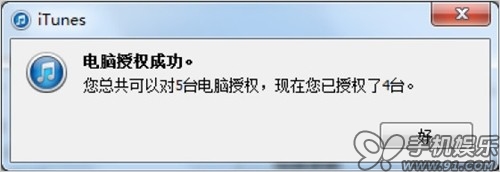 c) 完成後iTunes會提示授權成功,並顯示該賬號授權信息。一個Apple ID可對5台電腦授權,如果授權已使用完了,需要在之前的電腦上取消一個授權才可以繼續使用。