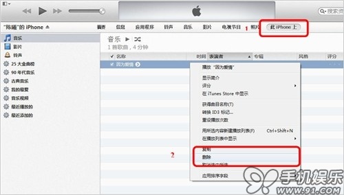 f) 進入iTunes的摘要頁面,點擊進入“在此iPhone上”,找到不需要的音樂,點擊鼠標右鍵既可刪除。