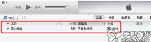 e) 選中“因為愛情”,直接拖拽至右側邊iOS設備中既可自動同步。