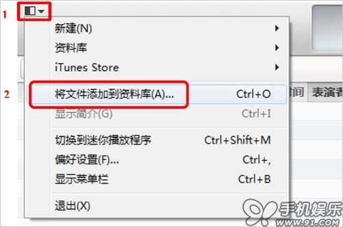 a) 點擊iTunes上左上角的菜單按鈕,在彈出的菜單中選擇“將文件添加到資料庫”,既可將准備好的音樂文件添加到iTunes的資料庫。
