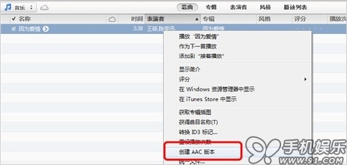 3) 在試聽好的音樂文件上點擊鼠標右鍵,選擇“創建AAC版本”
