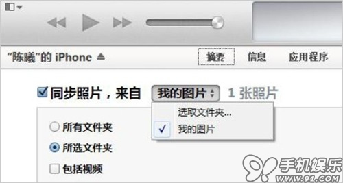 a) 在iTunes摘要頁面,點擊進入“照片”,在照片中勾選“同步照片”,選擇來自我的圖片,選擇需要同步的文件夾,點擊右下角的應用即可完成照片同步。同步的照片會出現在iOS設備的“照片”中,並生成與文件夾同名的相冊。