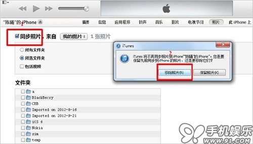 c) 如果要刪除照片,只需要取消“同步照片”前或對應用文件夾前的復選框,在彈出的對話框中選擇“移除照片”,點擊同步,即可刪除。
