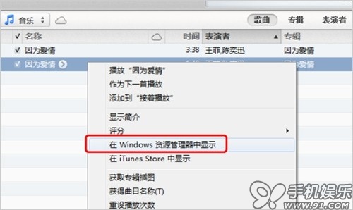 c) 在iTunes資料庫中的音樂裡,找到同步進去的“語音備忘錄”,在上面點擊鼠標右鍵,選擇“在Windows 資源管理器中顯示”,可以快速在資源管理中找到源文件。