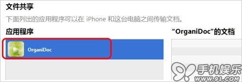 a) 在iTunes的摘要頁面,點擊“應用程序”,找到“文件共享”,在文件共享中點擊OrganiDoc,