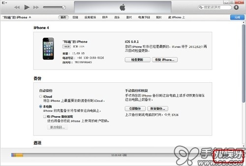 a) 在iTunes的摘要頁面,點擊“立即備份”與“恢復備份”,可以實現iOS設備整機進行備份與恢復。