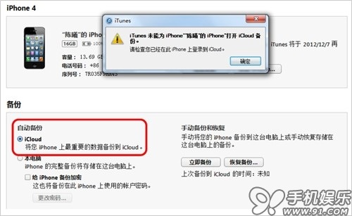 b) 需要注意的是,在iOS設備中沒有登陸iCloud服務時,備份文件只能存放在PC系統盤本地文件中的。點擊iCloud備份會提示沒有登陸。